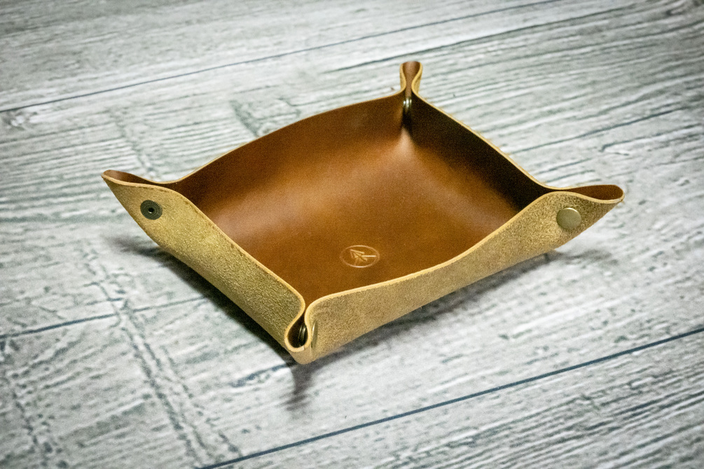 The Valet Tray is made full grain leather sourced from the top American tanneries. This is the snap version of the tray which allows you to make the tray flat or rolled for storage or travel.
